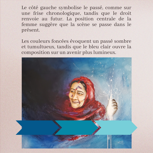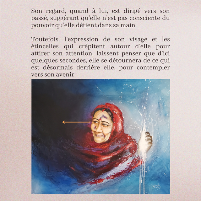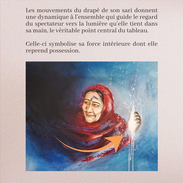 Une femme indienne regarde un passé sombre et tourmenté, le regard espiègle et un sourire aux lèvres. La vie a laissé ses marques sur son visage, mais elle sait au plus profond d'elle que les épreuves sont derrière elle. Elle ne le voit pas encore, mais elle tient déjà son avenir radieux dans sa main, parce qu'elle a osé sortir du cadre et être elle-même. Tout est déjà là, même si elle ne le voit pas encore.